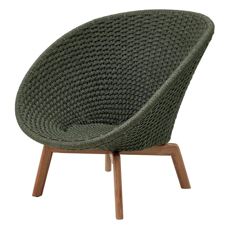Cane-linen Peacock-nojatuoli hurmaa ajattomalla muotoilullaan parvekkeella, puutarhassa ja terassilla. Foersom & Hiort-Lorenzenin suunnittelema Peacock-nojatuoli koostuu tiikkipuisista jaloista ja niiden päällä lepäävästä joustavan pehmeästä polypropeeni-istuimesta. Kuppimainen istuin on punottu Cane-linen omasta Soft Rope -materiaalista, joka säilyttää värinsä ja muotonsa vuodesta toiseen vaihtelevissakin sääolosuhteissa. Jalkarakenne saa hiljalleen ylleen tiikkipuulle ominaisen hopeanharmaan patinan.