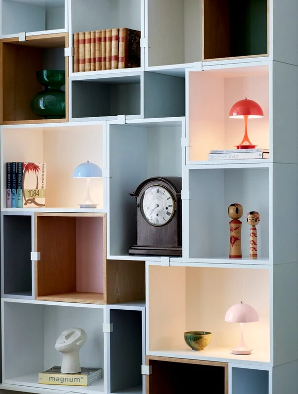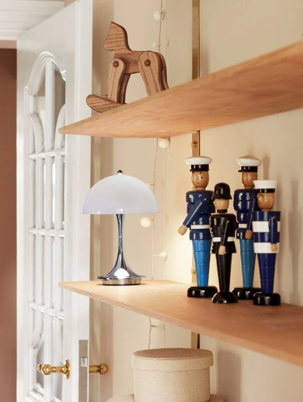 Louis Poulsenin Panthella Portable V2 -pöytävalaisin on ulkokäyttöön soveltuva, johdoton versio yhdestä tanskalaismuotoilija Verner Pantonin suosituimmasta valaisinmallista. Valaisin on ladattava ja himmennettävä – täydellä teholla se valaisee jopa 5 tunnin ajan parvekkeella tai puutarhassa, mistä se on helppo kantaa mukanaan sisälle yöksi. Valaisin toimii vaihdettavilla paristoilla, jotka voi ladata induktiolaturin tai mukana tulevan USB-kaapelin avulla.