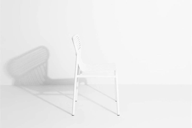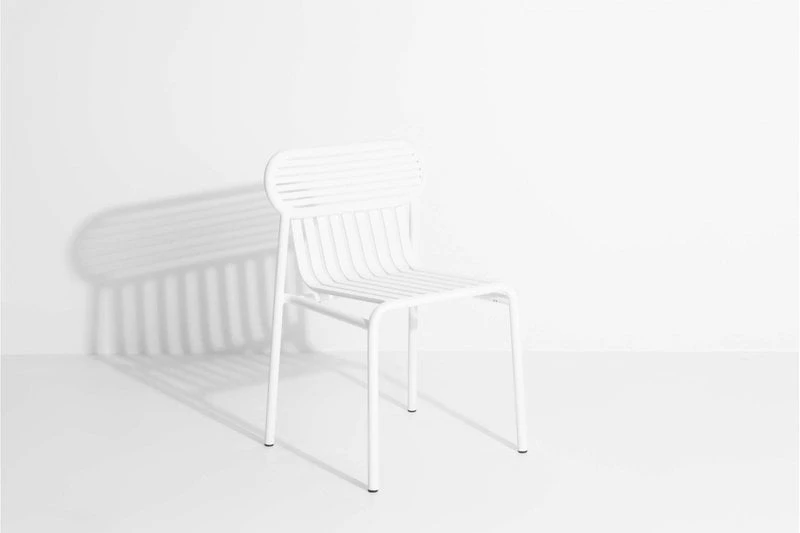Week-end-tuoli on osa ranskalaisen Petite Frituren alumiinisten ulkokalusteiden kokoelmaa. Viehättävien Weekend-tuolien tunnistettavimpiin piirteisiin kuuluvat niiden selkänojien ovaalinmuotoiset yksityiskohdat sekä vaaka- ja pystysuorien linjojen vuorottelu. Kaikki kokoelman tuolit ovat pinottavia.