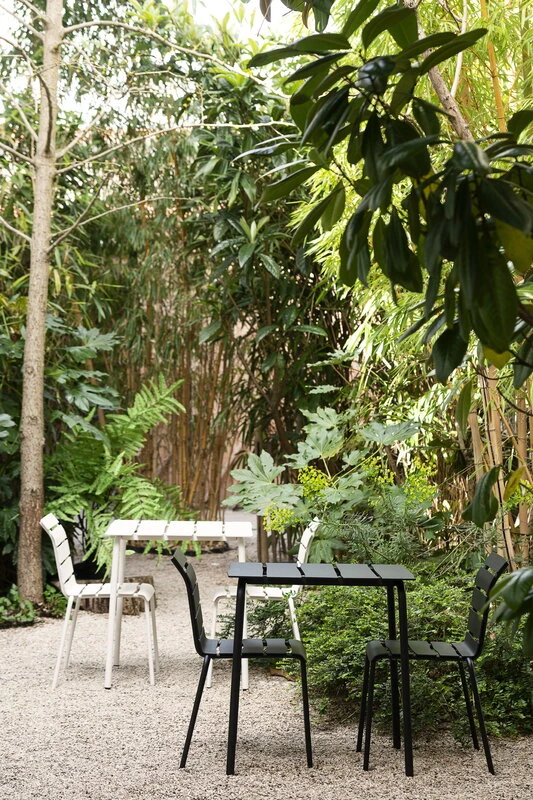 valerie objectsin Aligned-ruokapöydän näennäisen yksinkertainen ilme yllättää: epäsymmetriset, alumiinista valmistetut säleet antavat klassisen vähäeleiselle puutarhapöydälle täysin uudenlaisen persoonan. Tunnetun hollantilaissuunnittelija Maarten Baasin kekseliäs ja leikkisä kädenjälki on vahvasti esillä jokaisessa yksityiskohdassa – Aligned-pöytä on luotu täsmällisesti Baasin lyijykynäpiirroksen pohjalta. Kaunis ja kestävä ulkokäyttöön soveltuva ruokapöytä sopii niin puutarhaan kuin kesämökin terassillekin ja sen hurmaavan persoonallinen ilme saa suupielet kääntymään hymyyn vuodesta toiseen.